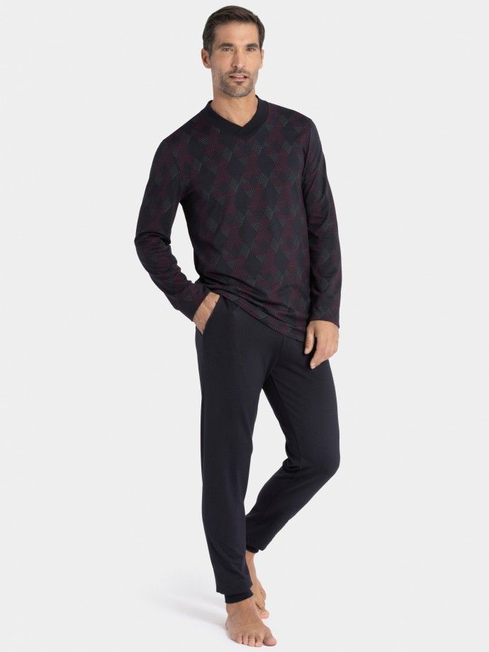 T-shirt imprimé col V à manches longues et pantalon uni avec poches latérales.